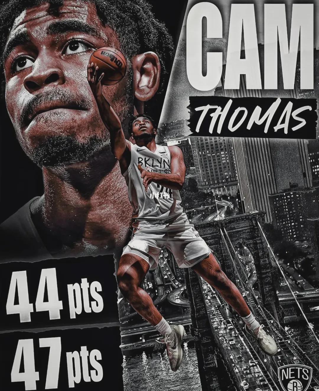 托马斯出生于2001年10月13日,身高1米91,21届首轮第27号秀,为期四年半的篮网生涯,合计出战239场常规赛,场均上阵23.3分钟,贡献15.2分2.5板2.2助1.5失误,三项命中率43.5%、34.3%和85.8%,曾在2023年初连续三场40+,分别轰下44分、47分和43分。